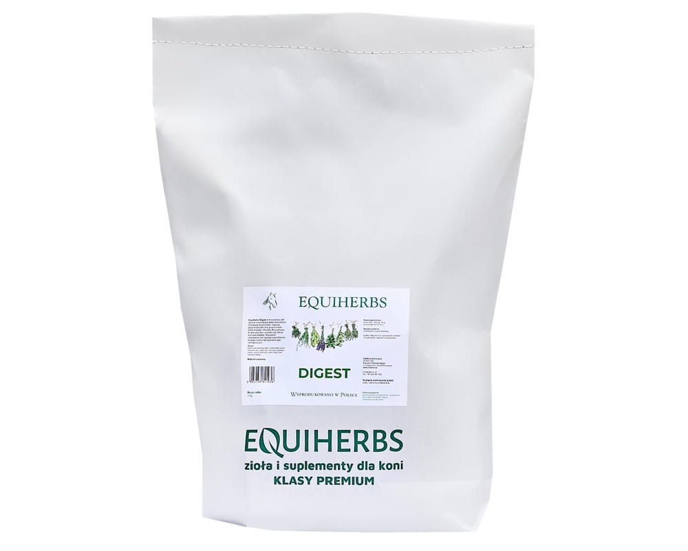 Equiherbs Digest to mieszanka ziół dla koni wspierająca układ pokarmowy. Zmniejsza ryzyko kolek, reguluje perystaltykę jelit oraz pracę układu pokarmowego.