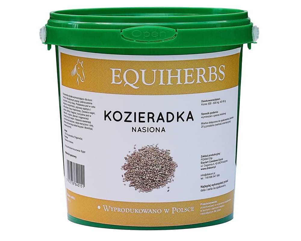Kozieradka działa wzmacniająco dla koni mocno obciążonych pracą i jednocześnie ryzykiem utraty masy. Podawana jest w celu wsparcia odporności, poprawy apetytu i odbudowy masy mięśniowej. Zawiera wapń, potas, siarkę i magnez, korzystna jest w stanach urazów, złamań i regeneracji zmęczonych mięśni. Nasiona zawierają substancje śluzowe, olejki eteryczne i olej, które wzmacniają słabe kopyta i likwidują matową sierść.
