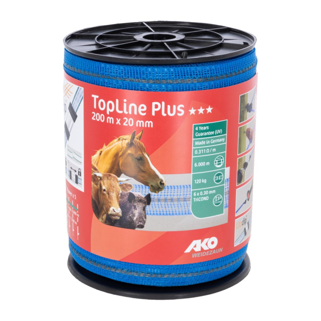 Taśma ogrodzeniowa TopLine Plus 200 m x 20 mm marki Kerbl to doskonałe rozwiązanie dla średnich i długich systemów ogrodzeniowych. Dzięki zastosowaniu przewodników TriCOND, taśma zapewnia pięciokrotnie wyższą przewodność w porównaniu do standardowych taśm, co przekłada się na skuteczniejsze działanie ogrodzenia elektrycznego. Niebieski kolor taśmy zwiększa jej widoczność dla zwierząt, minimalizując ryzyko przypadkowego kontaktu.